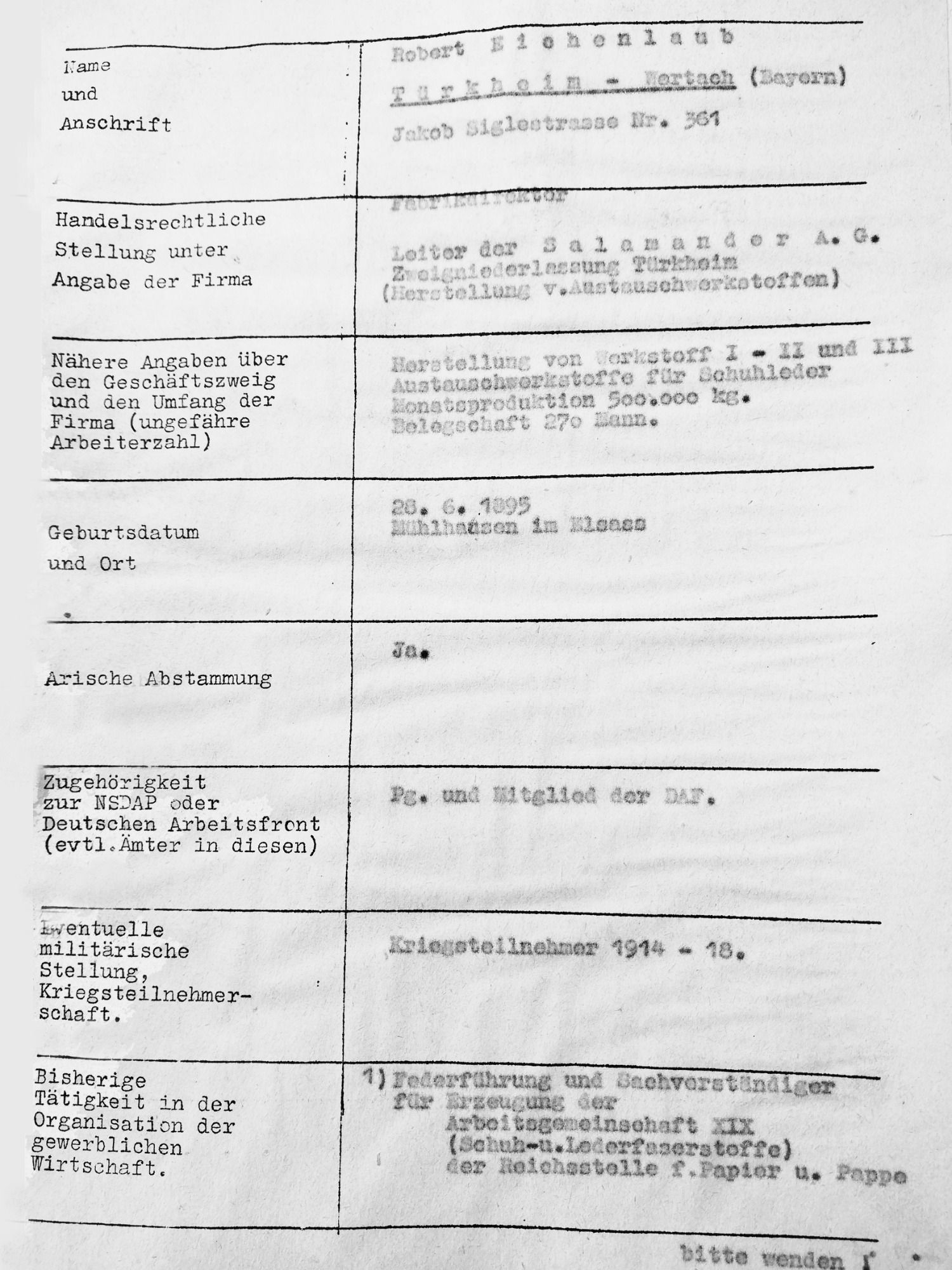 Da auch bald Lederknappheit herrschte, mussten neue Materialien zur Schuhherstellung entwickelt werden. Der Spezialist für diese technischen Verfahren war Robert Eichenlaub. Eichenlaub war NSDAP-Mitglied und Mitglied der Deutschen Arbeitsfront. (siehe Personalbogen BA R 13-XIII/270)³. Er leitete vollkommen eigenständig den Zweigbetrieb Salamander A.G., die dem Reichswirtschaftsministerium unterstand, und wurde am 16.11.1940 vom Leiter der Wirtschaftsgruppe Lederindustrie, Ernst Ammer, zum Leiter der Fachabteilung Lederfaserwerkstoffe ernannt. (ebenda)⁴.